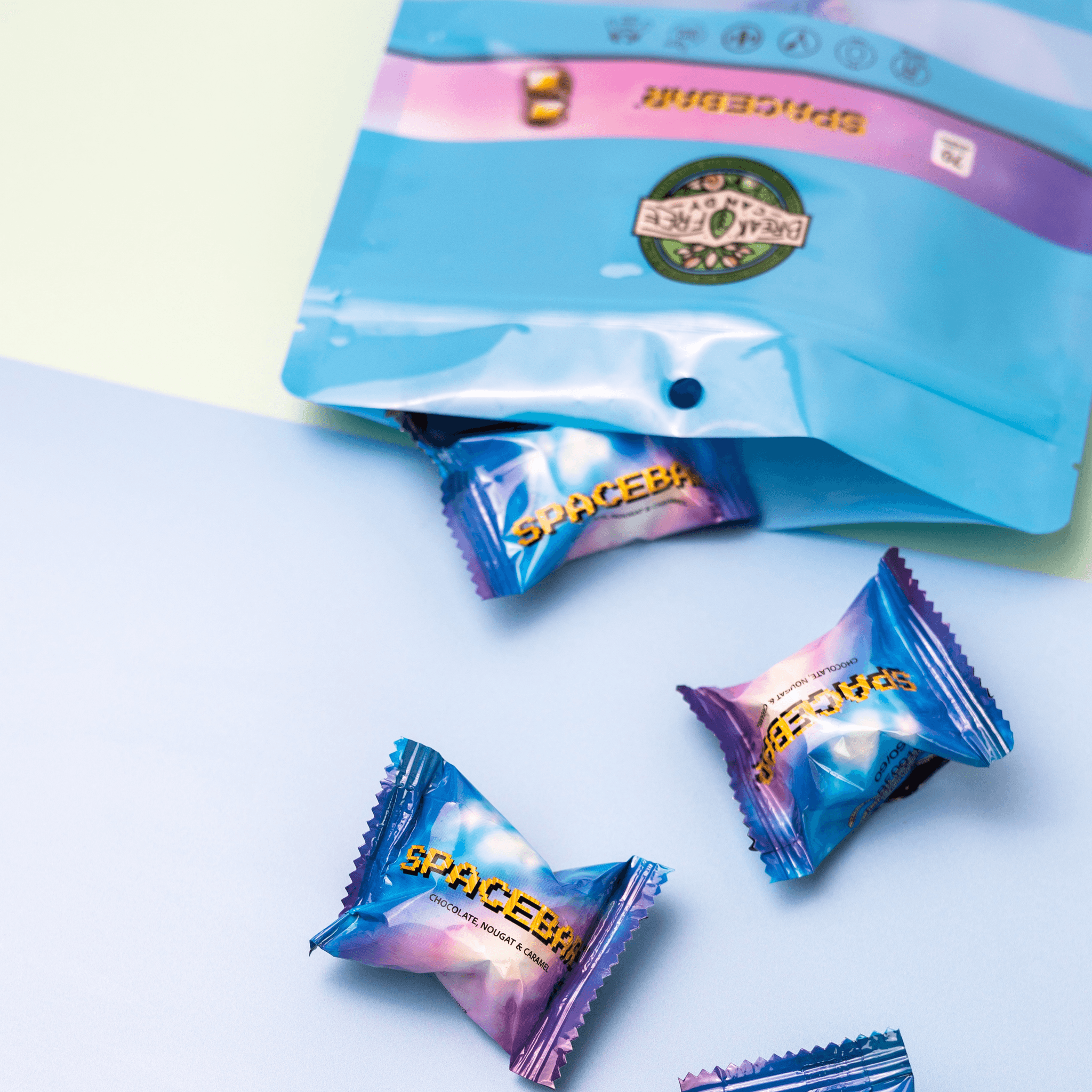 Individually wrapped Mini Space Bars—perfect for snacking or gifting! Each bite combines caramel nougat covered in rich vegan chocolate, giving you that classic taste you love, made cruelty-free and handmade with care. (Processed on equipment that also processes gluten, peanuts and pecans) (Chocolate is sourced from a manufacturer that handles milk products)