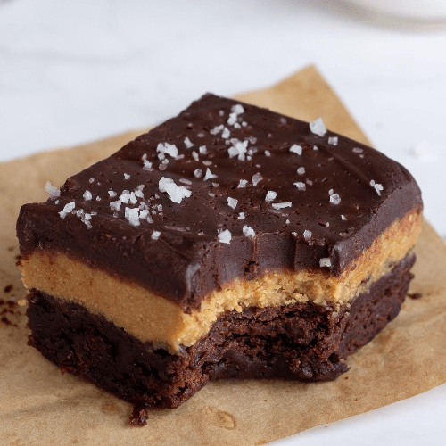 Layered bar with a brownie bottom, graham cracker peanut butter center, and topped with a chocolate ganache.