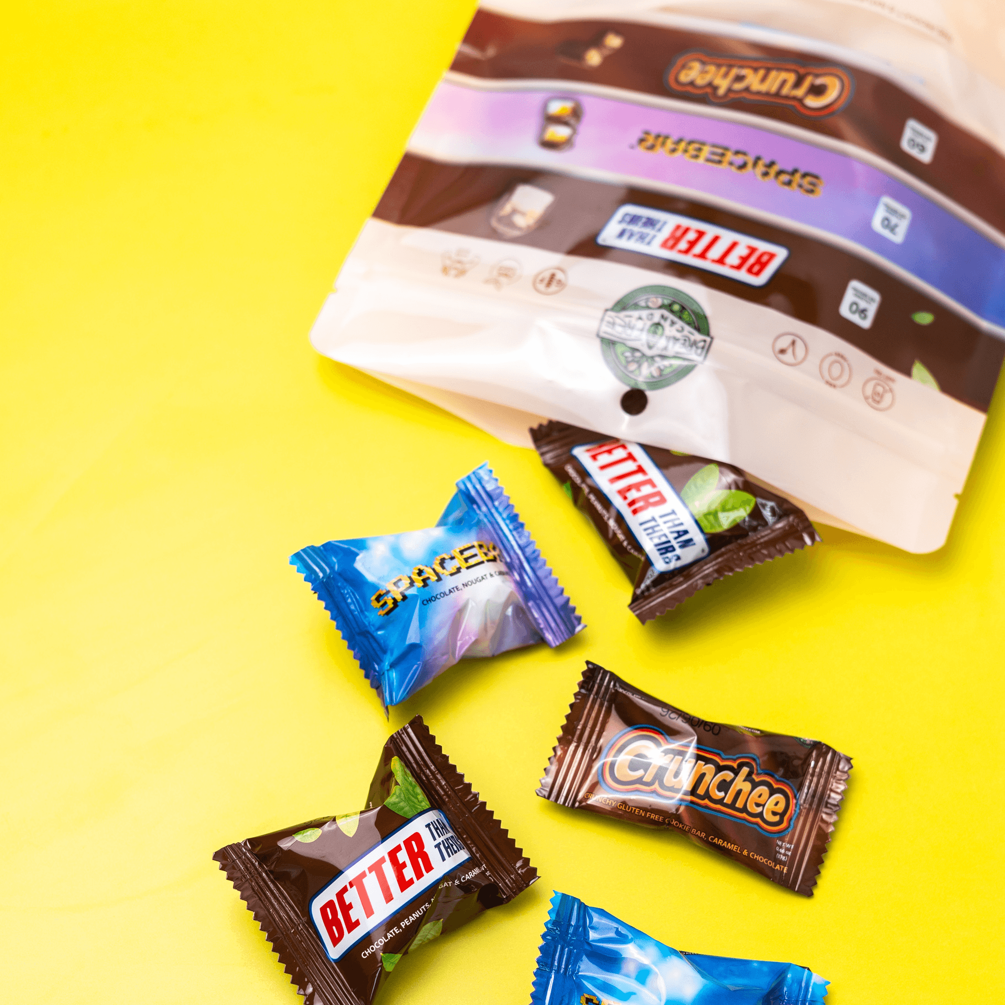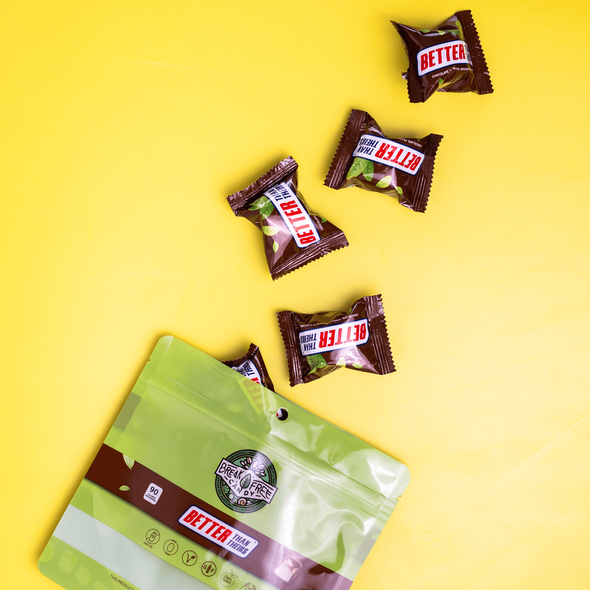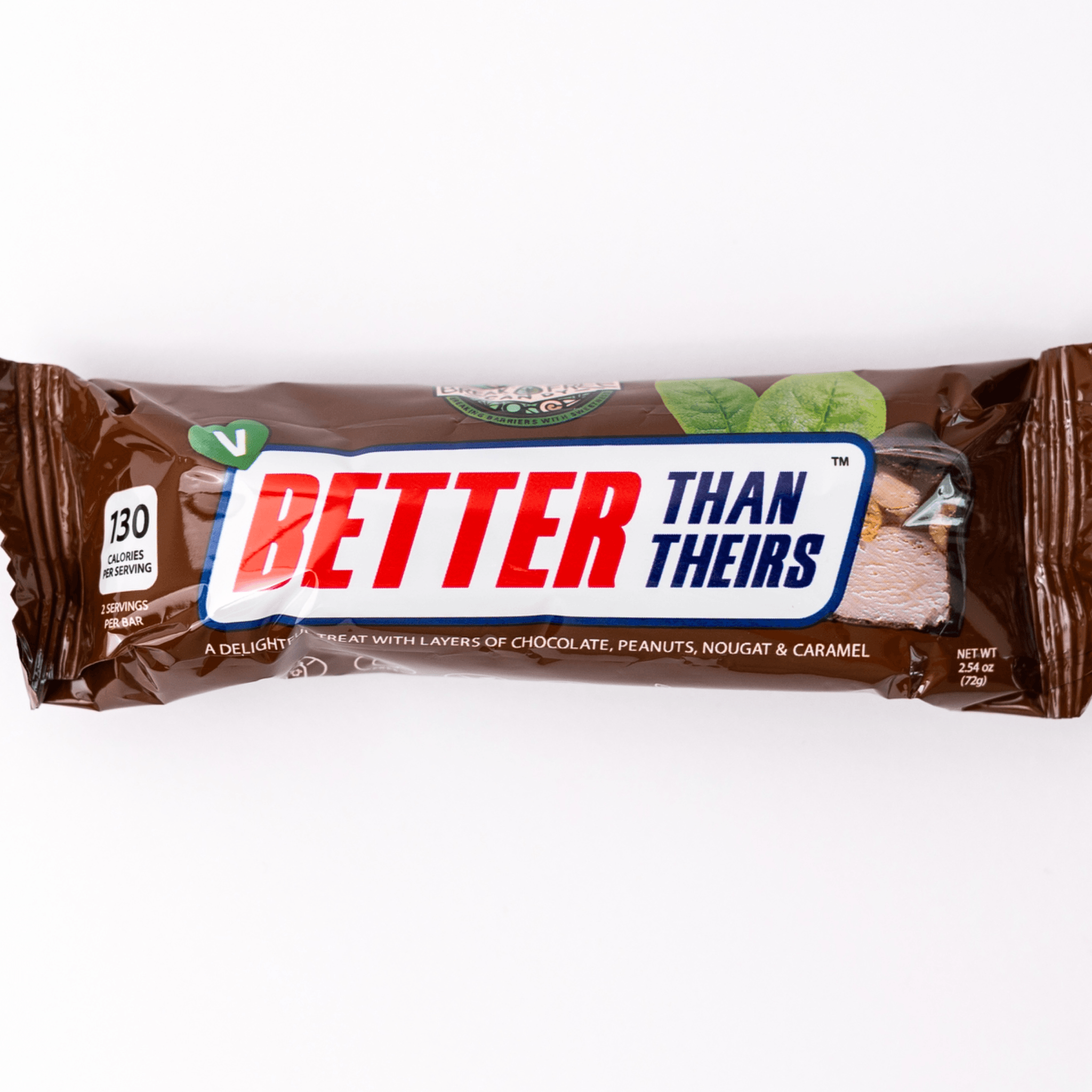 Individually wrapped Better Than Theirs Minis—ideal for snacking or sharing! Each bite has chewy nougat, gooey caramel, crunchy peanuts, and rich vegan chocolate for that classic candy bar taste, only kinder and handmade with love. (Processed on equipment that also processes gluten and pecans) (Chocolate is sourced from a manufacturer that handles milk products)