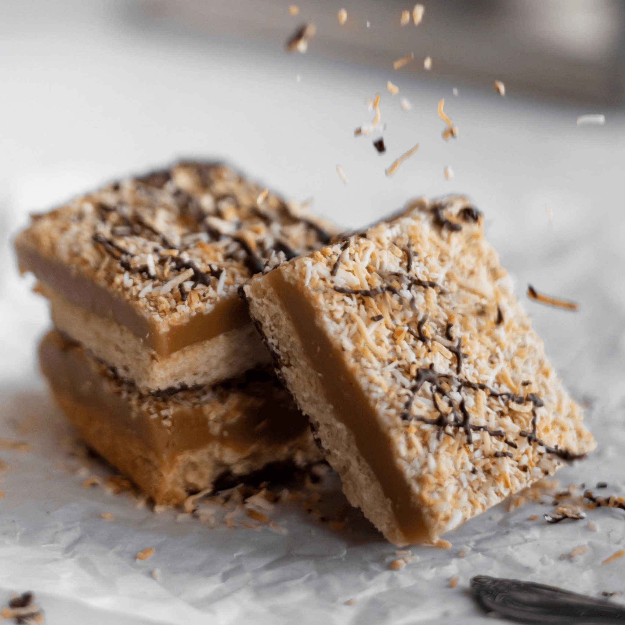 A tender, gluten-free shortbread base layered with thick golden caramel, topped with toasted coconut shreds, and finished with a rich drizzle of semi-sweet chocolate. Chewy, toasty, and decadently sweet with just the right hint of crunch. Island-inspired indulgence — completely plant-based and completely irresistible.