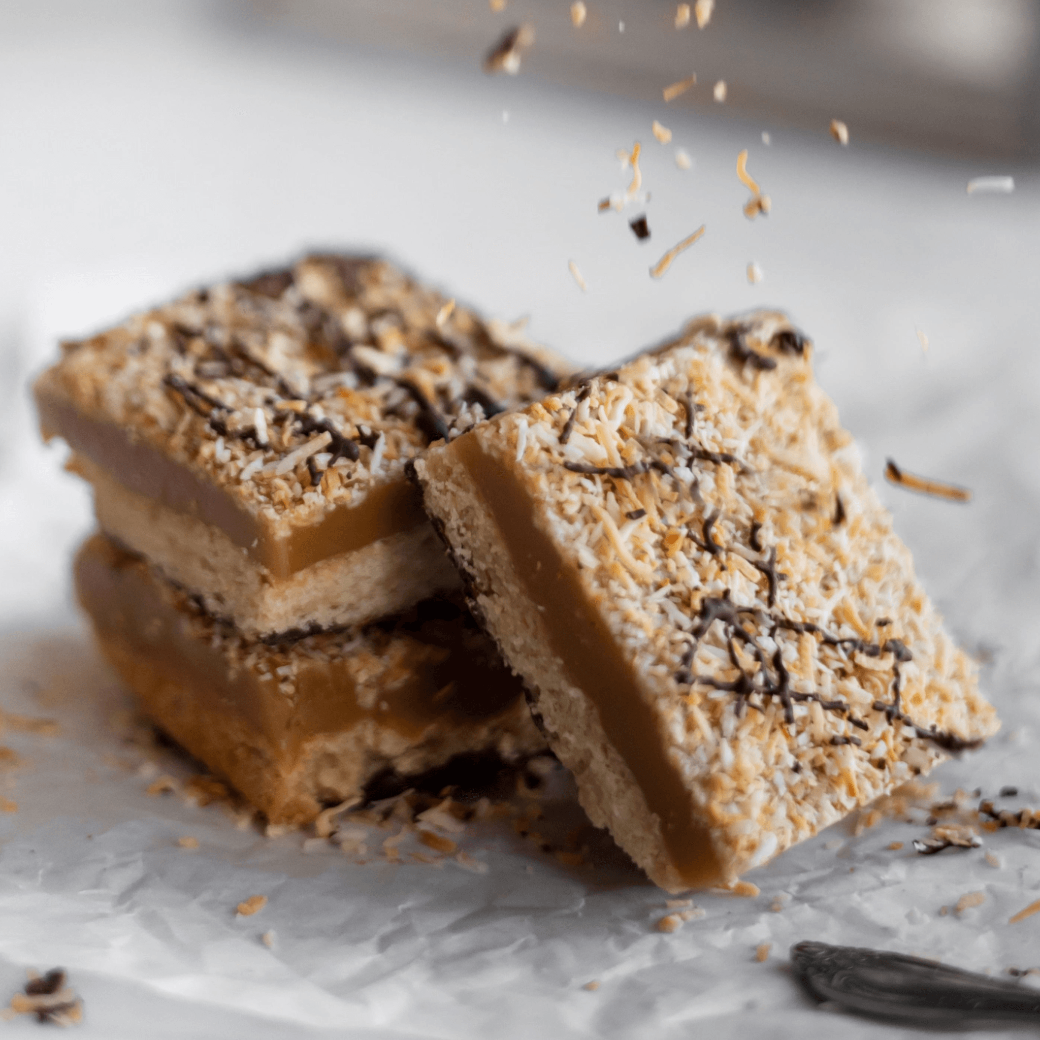A buttery shortbread base piled high with a thick layer of golden caramel, blanketed in toasted coconut shreds, and finished with a seductive drizzle of semi-sweet chocolate. Sweet, chewy, a little toasty, and just the right amount of messy. It’s island vibes meets bakery indulgence — and yes, it’s fully plant-based.