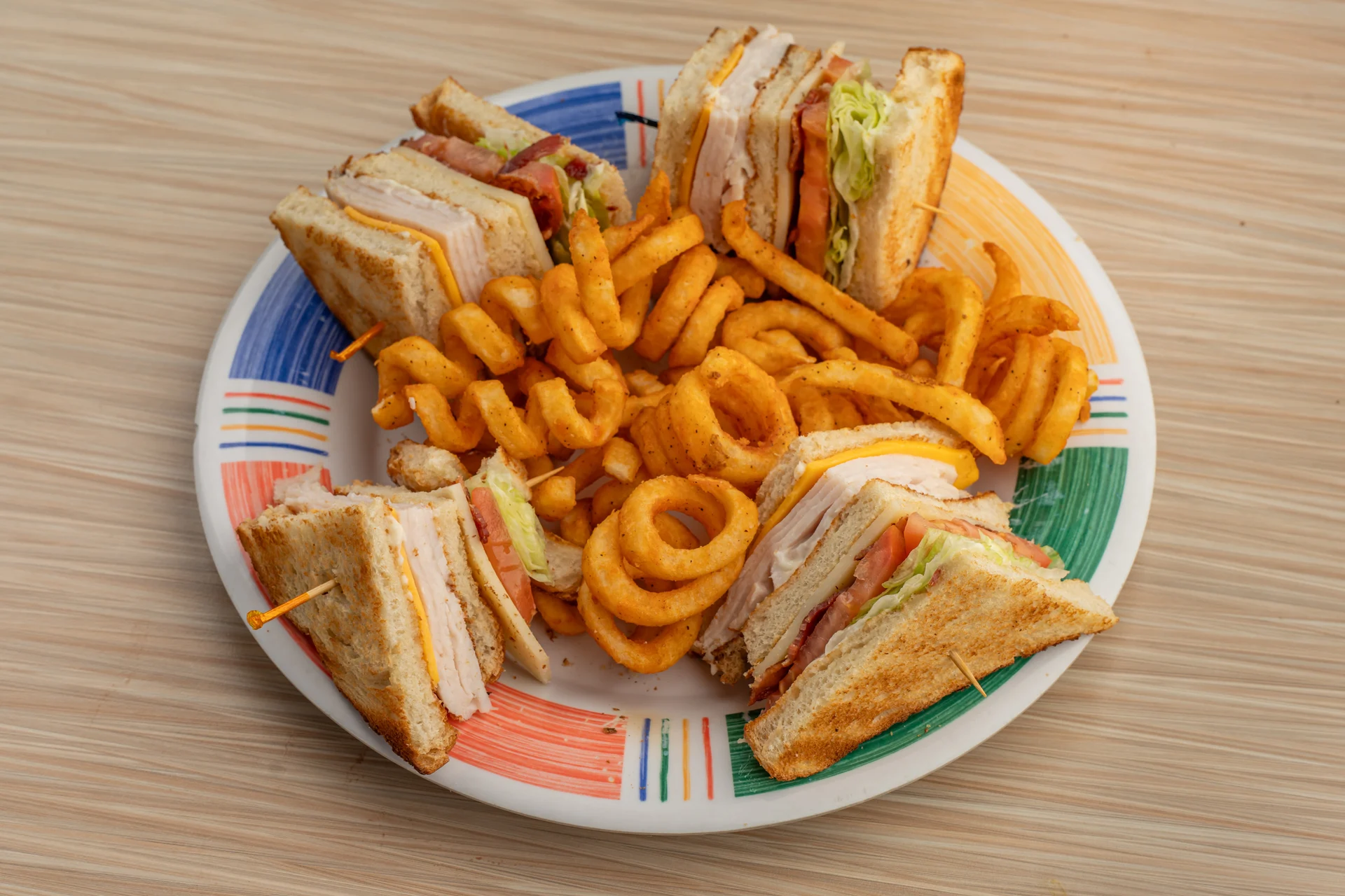 Turkey, bacon, Swiss and American cheese, lettuce, tomato, and mayo