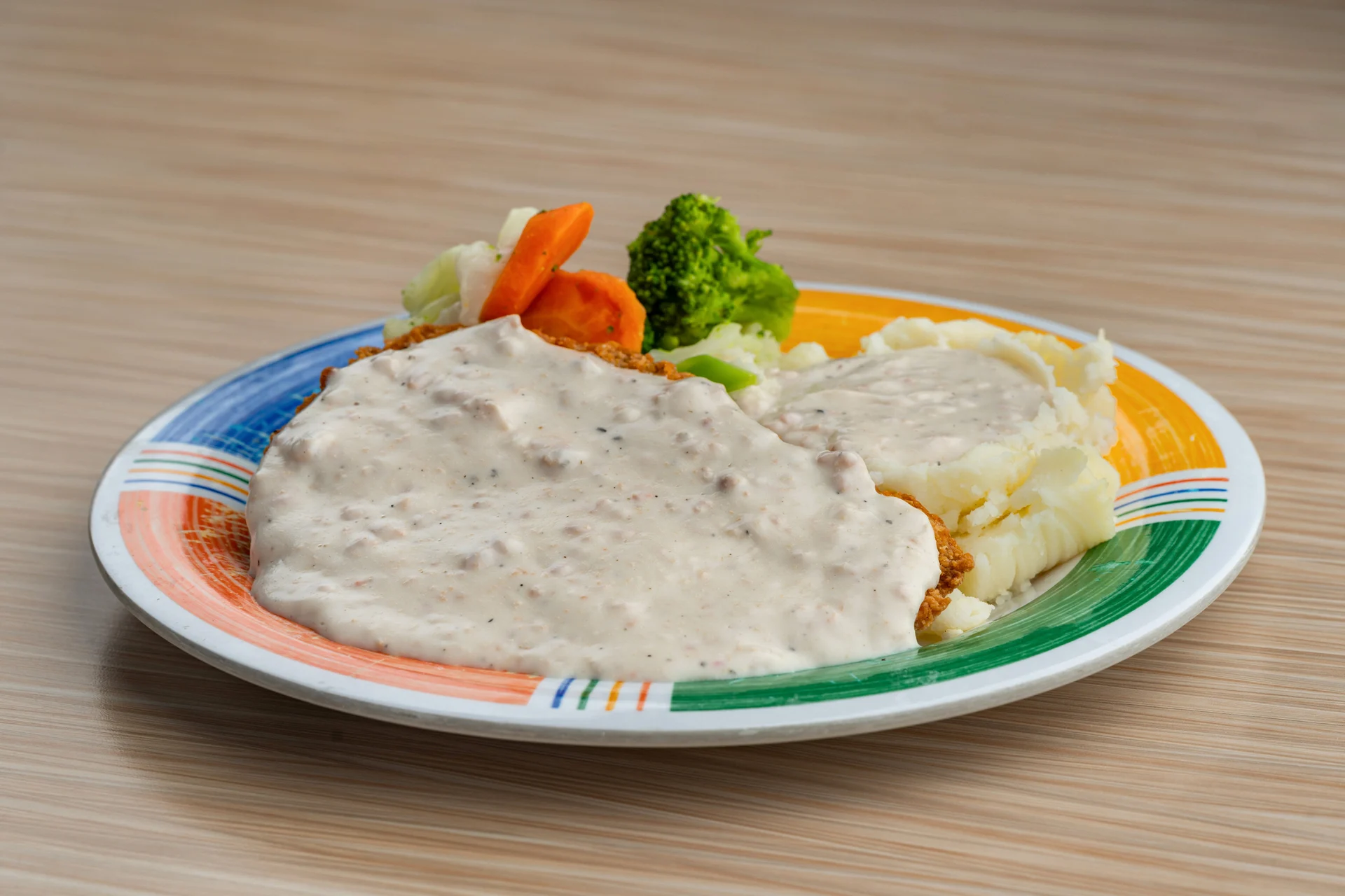 Chicken-fried steak smothered in sausage gravy with steamed vegetables and your choice of potato or rice pilaf. Served with a warm dinner roll