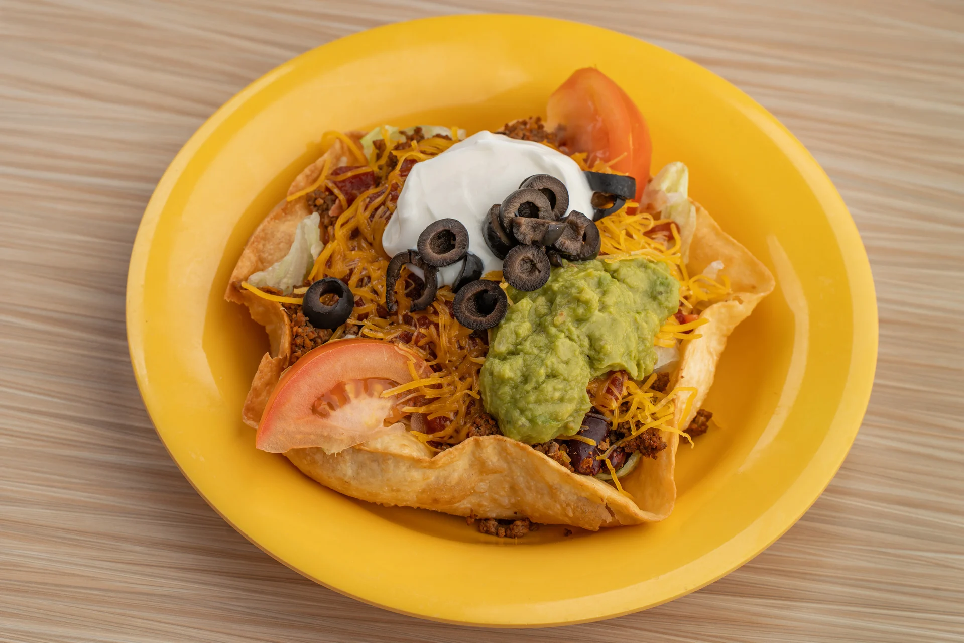 Tortilla bowl with greens, ground beef, Cheddar cheese, kidney beans, tomatoes, olives, and topped with guacamole, sour cream, and salsa