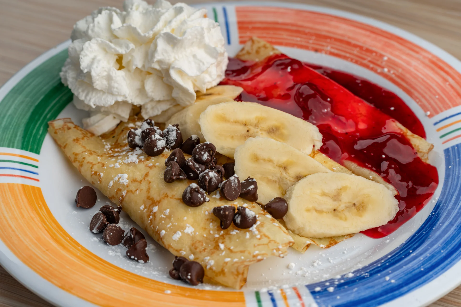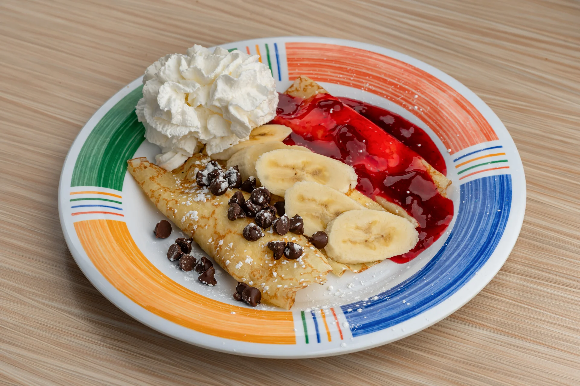 Three delicious crepes filled with cream cheese and topped with strawberries (fresh when in season), blueberry compote, or bananas and whipped cream