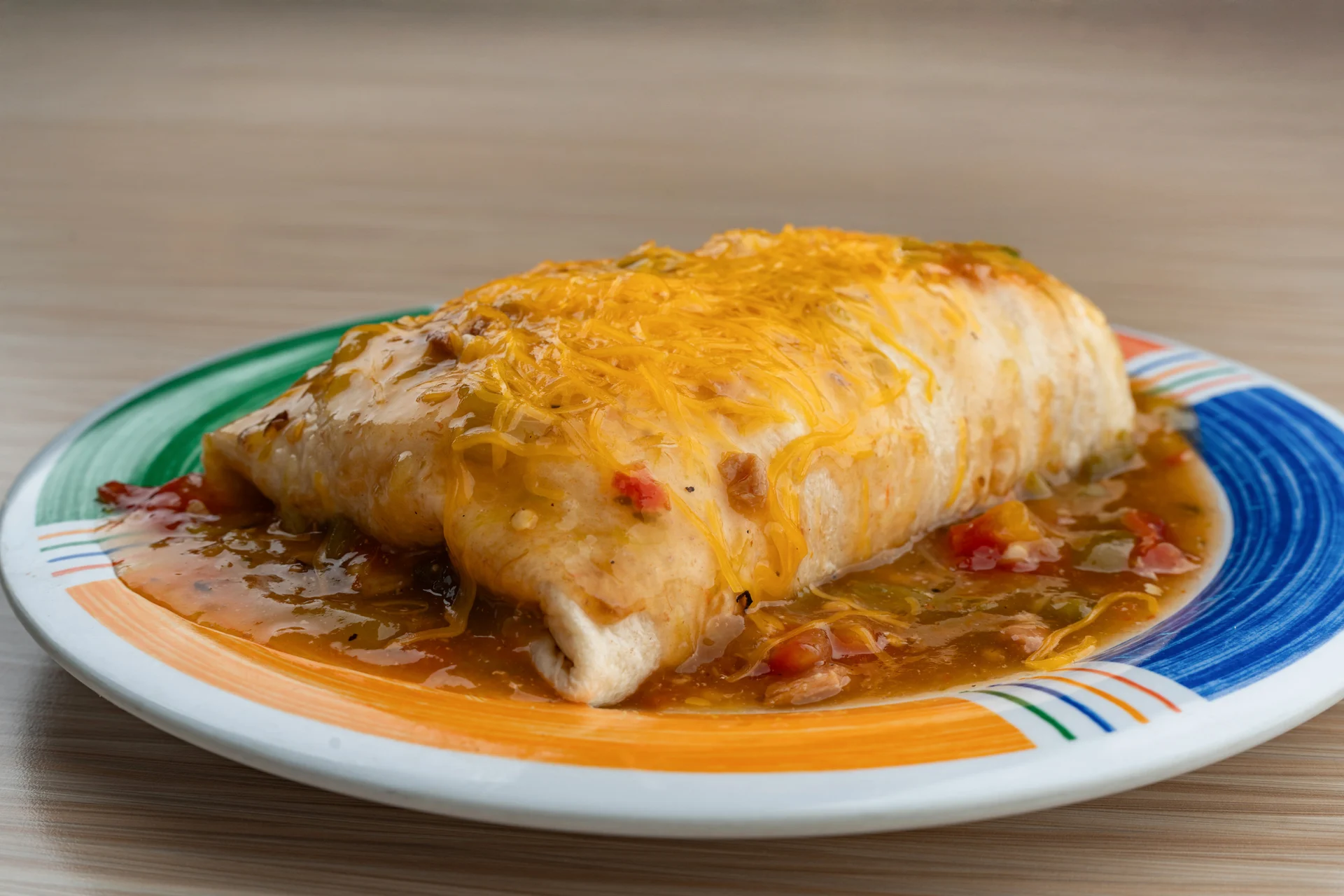 Scrambled eggs with ham, onion, green peppers, and Cheddar cheese rolled with hash browns in a flour tortilla covered in chili verde