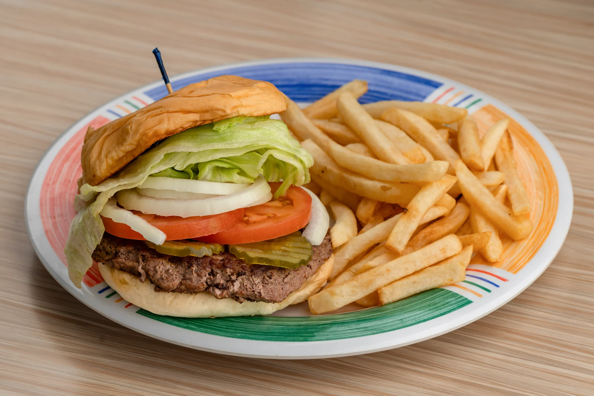 Quarter-pound ground beef patty with lettuce, tomato, onions, and pickles with French fries