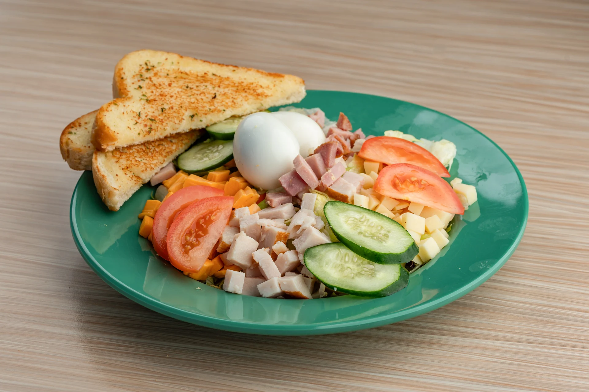 Ham, turkey breast, diced American and Swiss cheese with tomato, cucumber, hard-boiled egg, and garlic toast