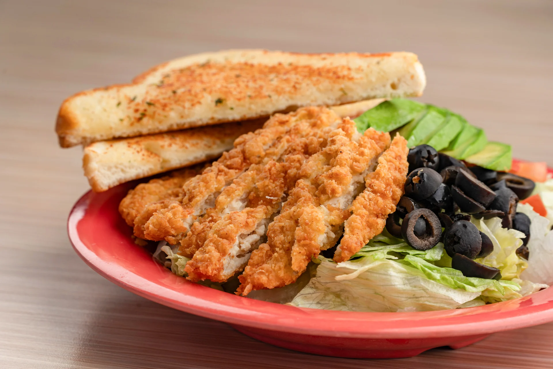 Strips of grilled or breaded chicken, bacon, tomatoes, olives, avocado, and Parmesan cheese with garlic toast