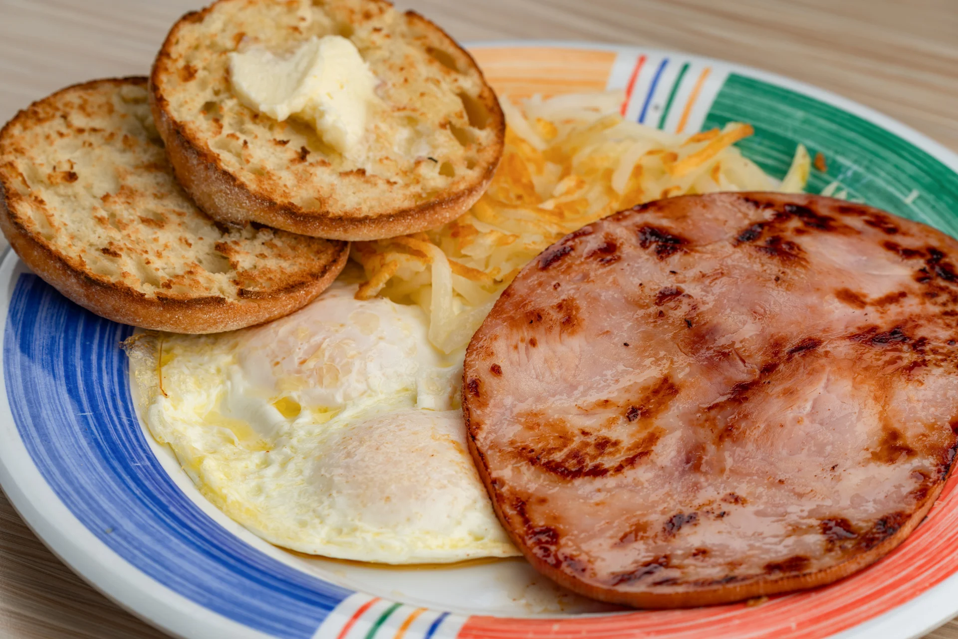 Two eggs cooked to order, choice of ham, bacon, or sausage, served with hash browns and choice of breakfast bread
