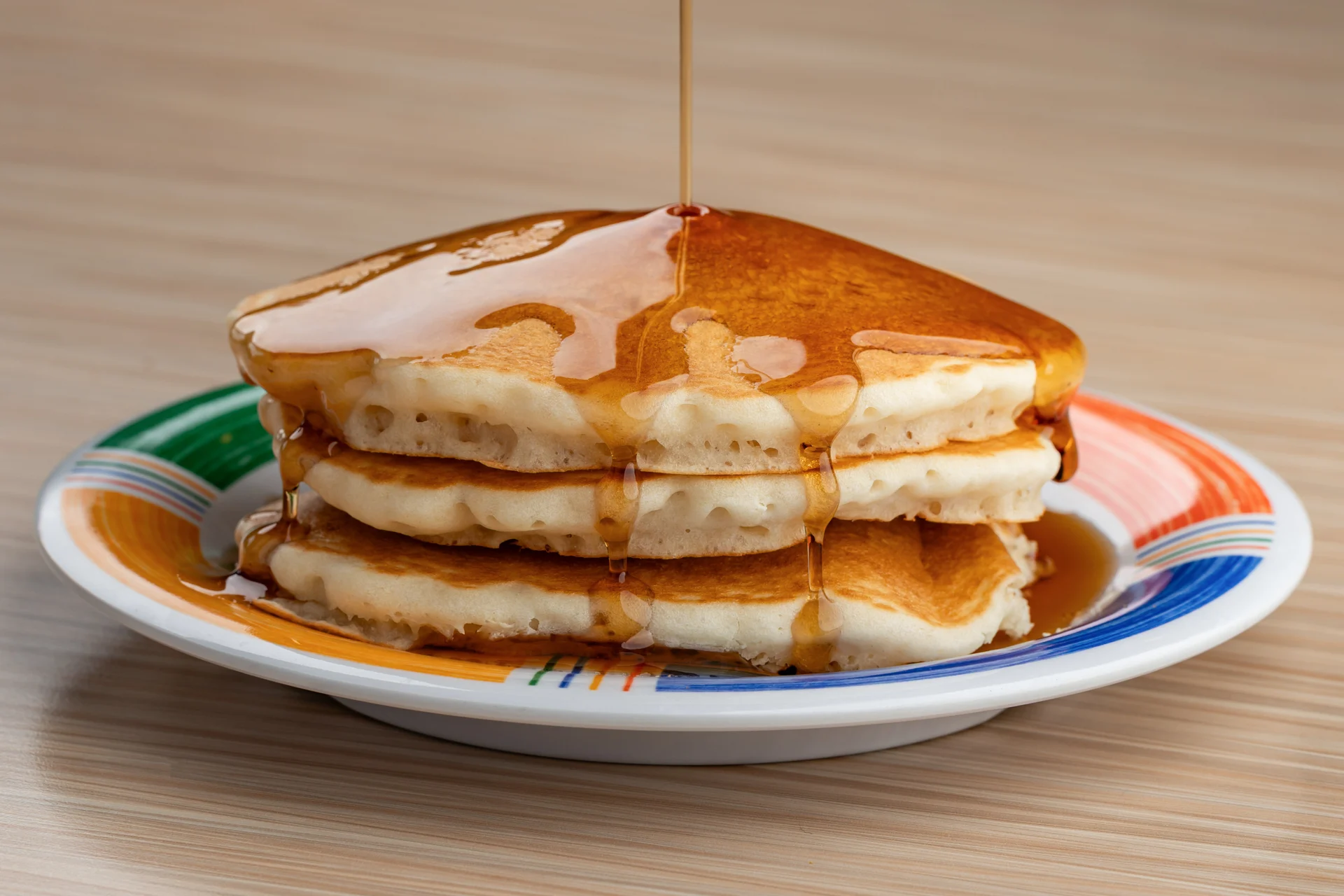 Four wedges of French toast, butter, and maple syrup