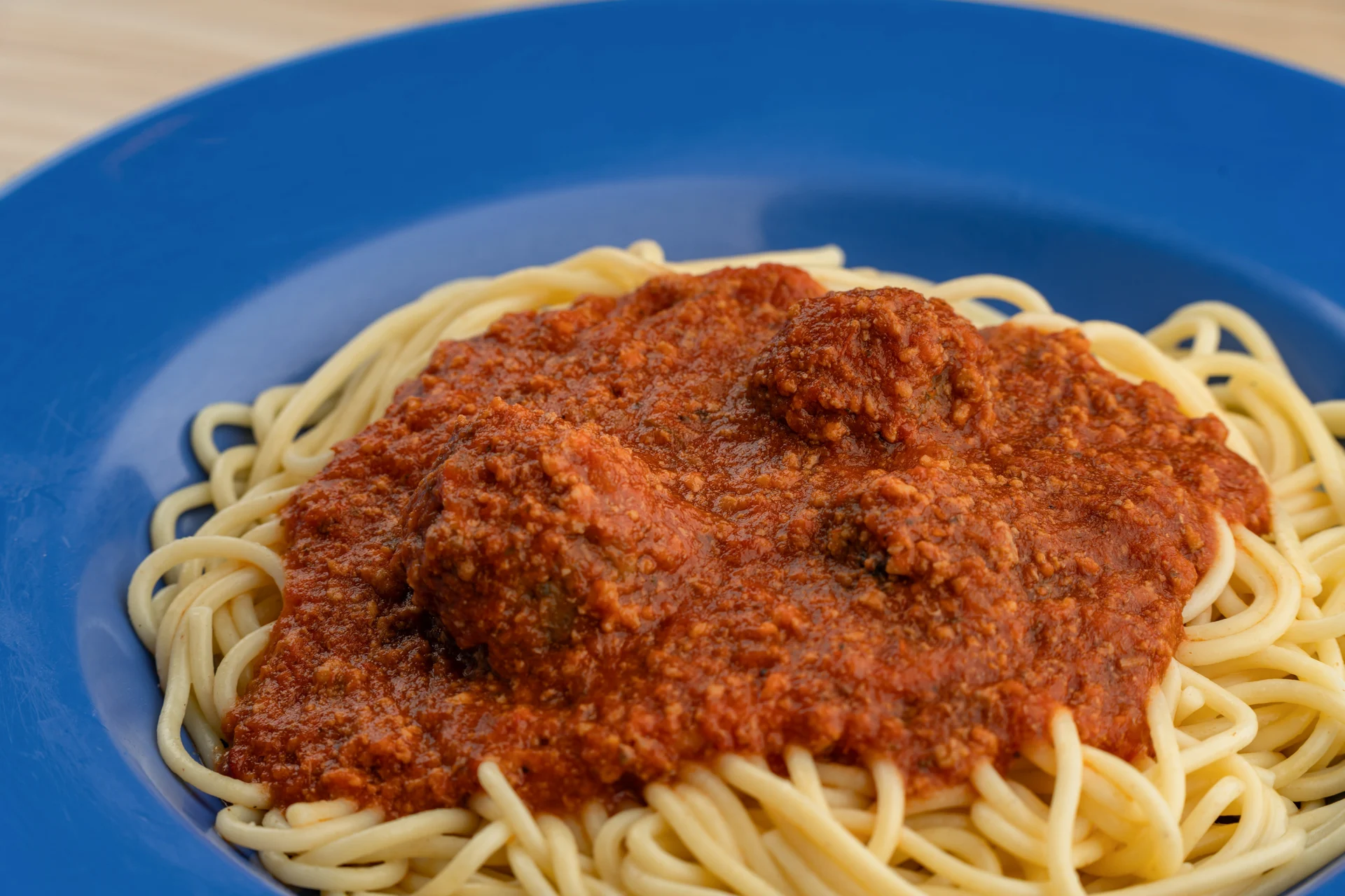 Seasoned meat sauce and Italian meatballs served over spaghetti noodles with two slices of garlic toast