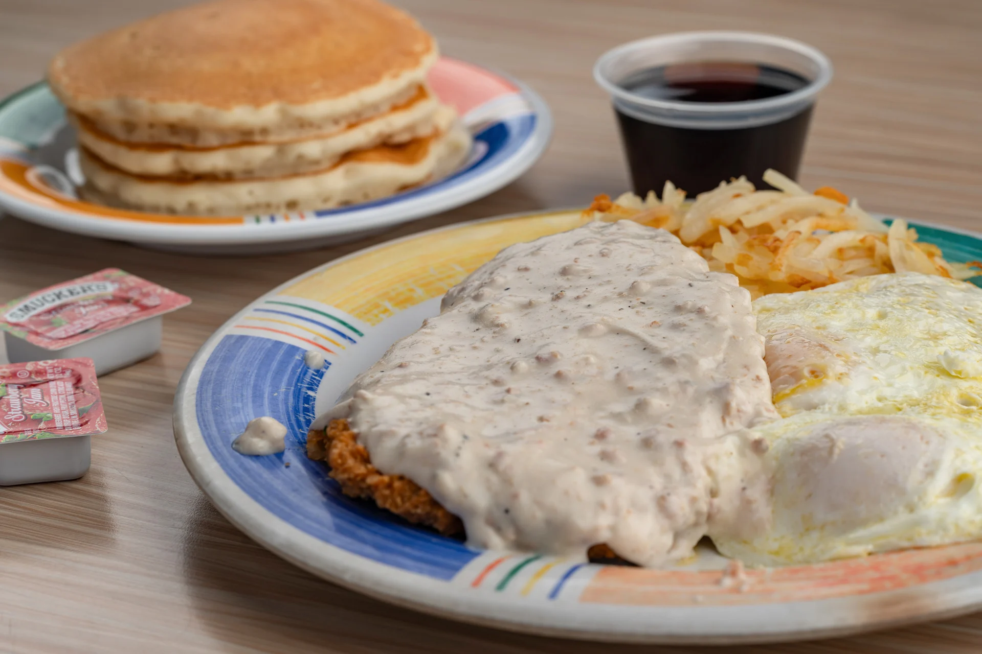 Chicken-fried steak smothered in sausage gravy served with two eggs, hash browns, and a choice of breakfast bread