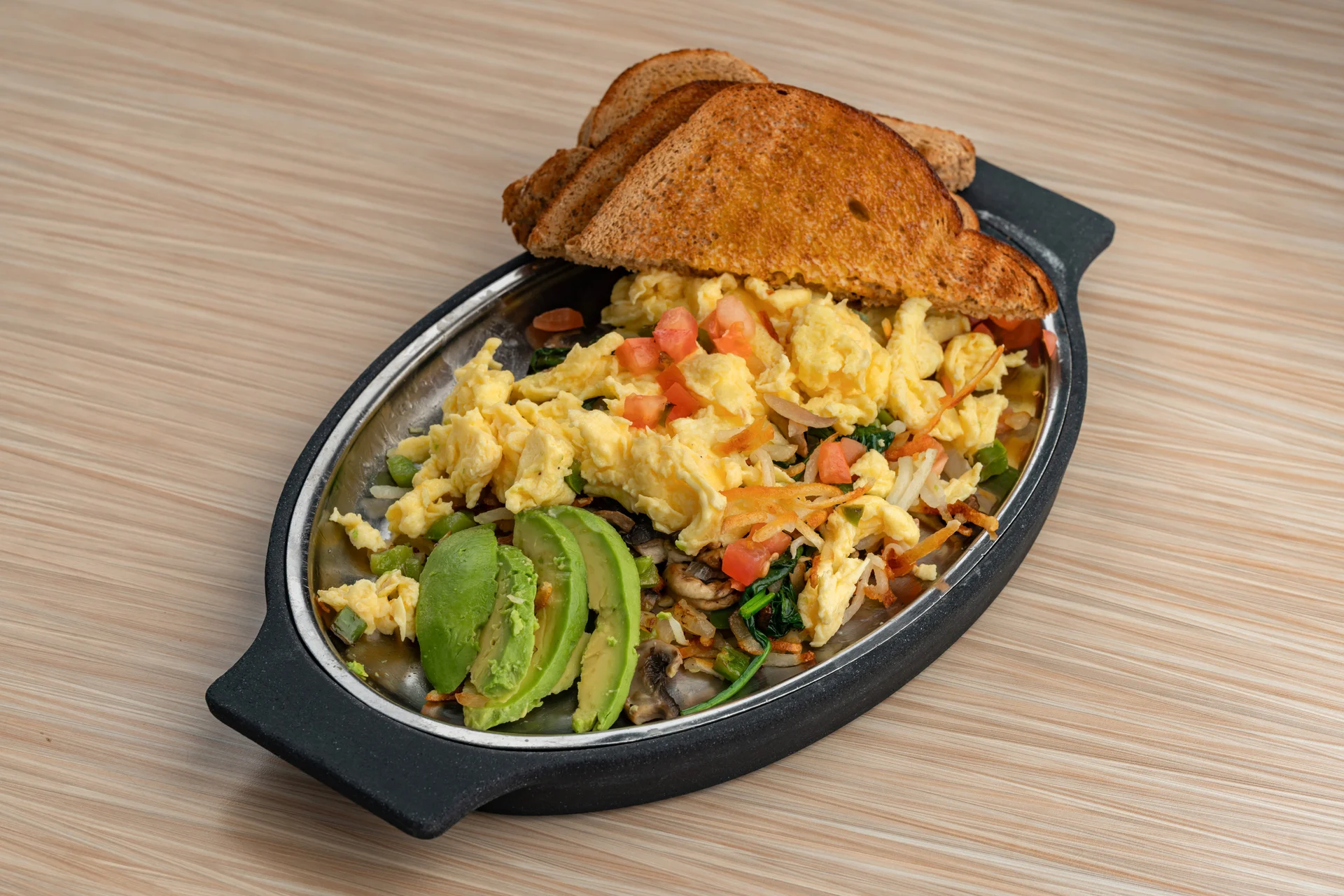 Hash browns topped with onions, green peppers, mushrooms, spinach, avocado slices, diced tomatoes, and two eggs with a choice of breakfast bread